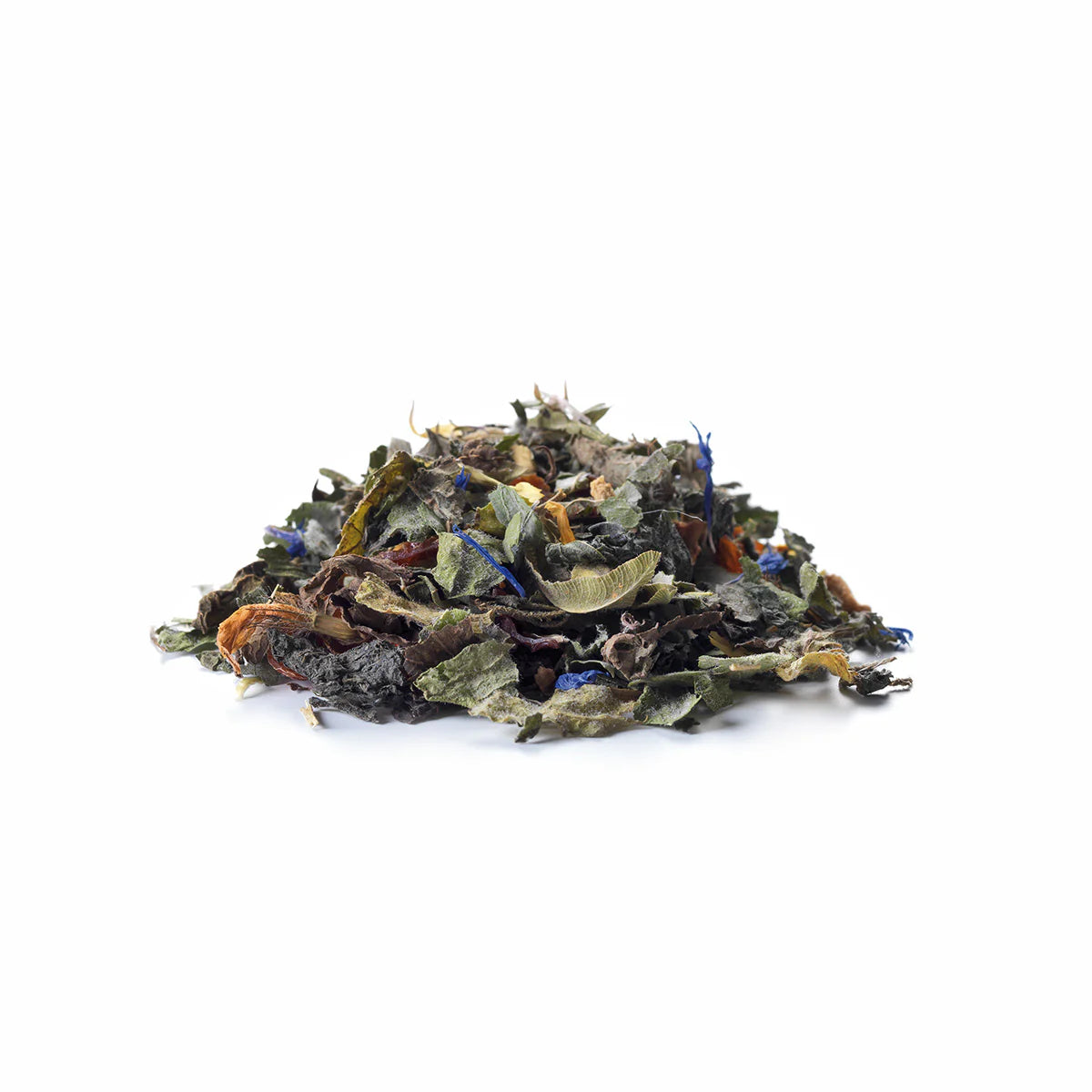 Le mélange se compose de diverses herbes telles que l'ortie, la mélisse, la menthe poivrée et la menthe pomme. D'autres fleurs et du trèfle rouge, associés à une touche d'églantier, créent ce mélange unique.
