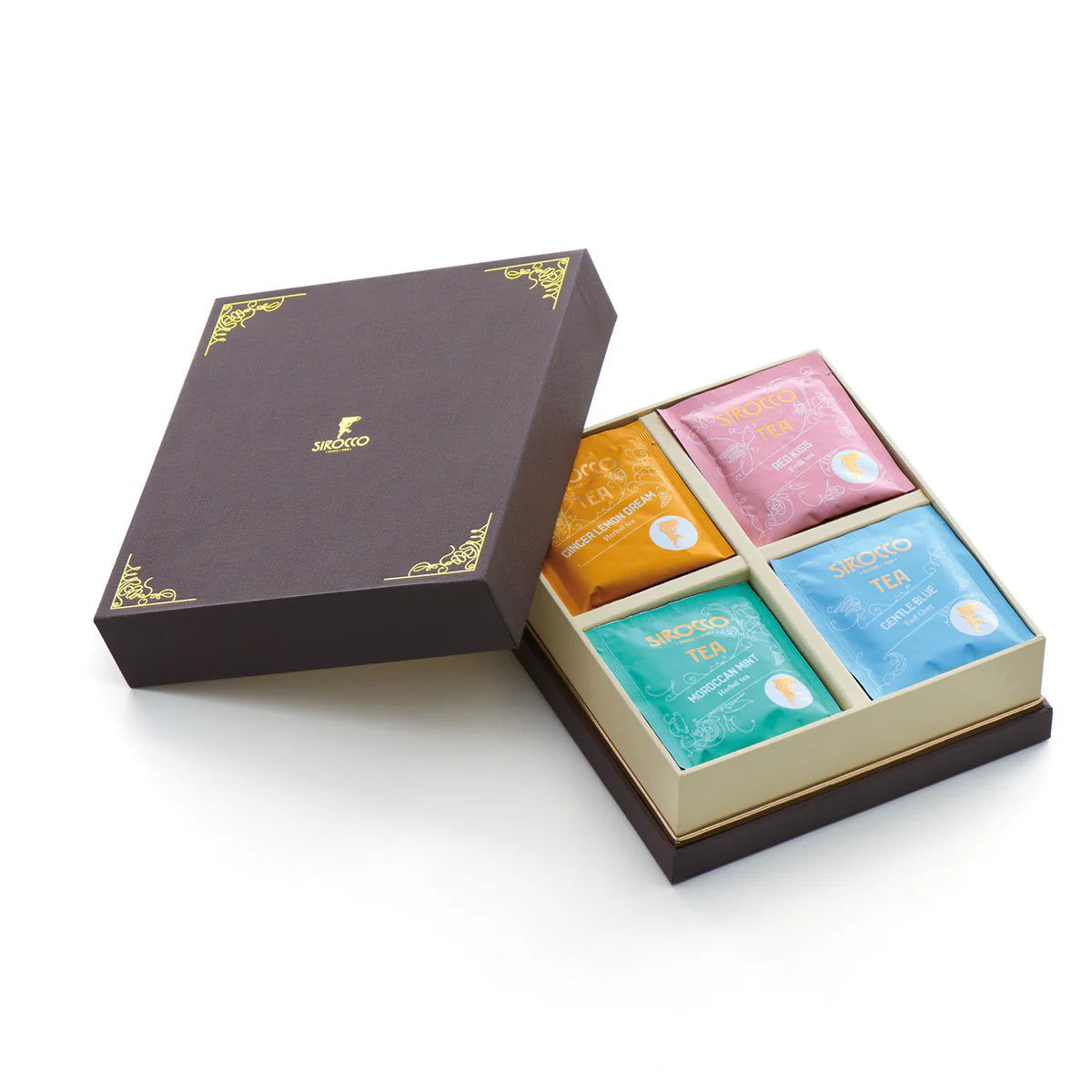 Le coffret contient les thés bio suivants : Ginger Lemon Dream, Red Kiss, Marocain Menthe et Gentle Blue (au total 28 sachets).