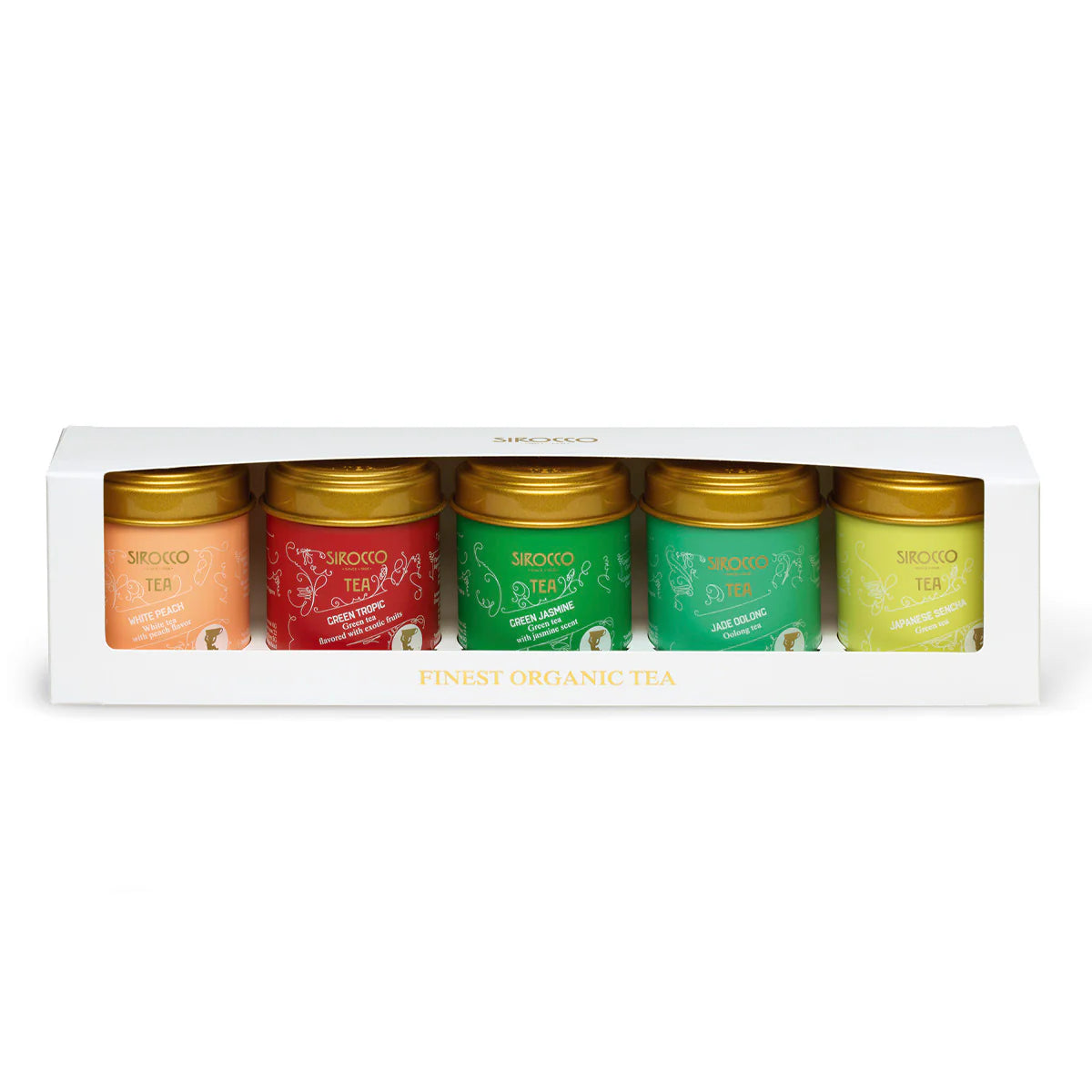 Sélection thés verts:Pêche Blanche, Thé Vert Tropical, Thé Vert Jasmin, Oolong Jade et Sencha Japonais.
