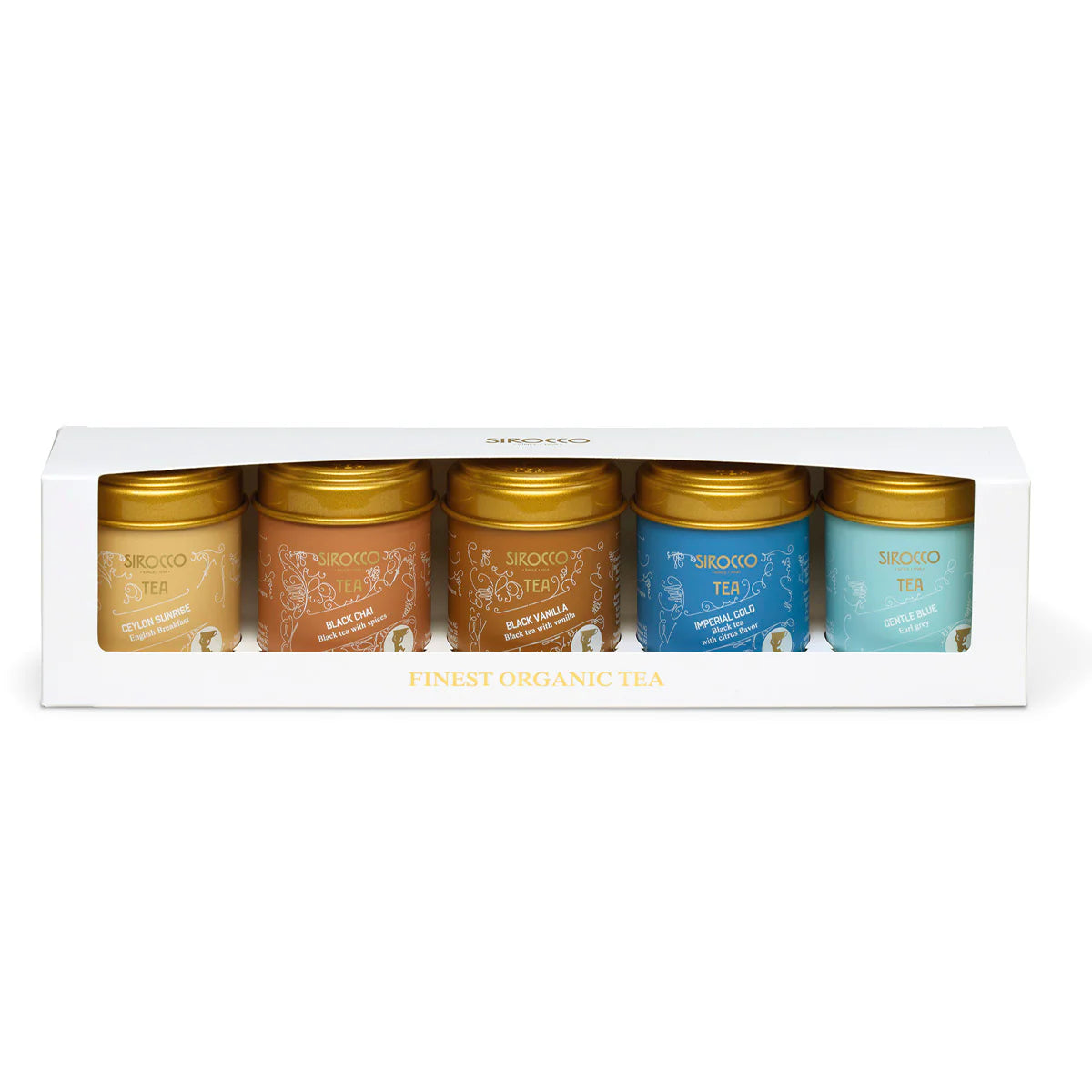 Sélection thés noirs:Ceylon Sunrise, Black Chai, Black Vanilla, Imperial Gold et Gentle Blue.